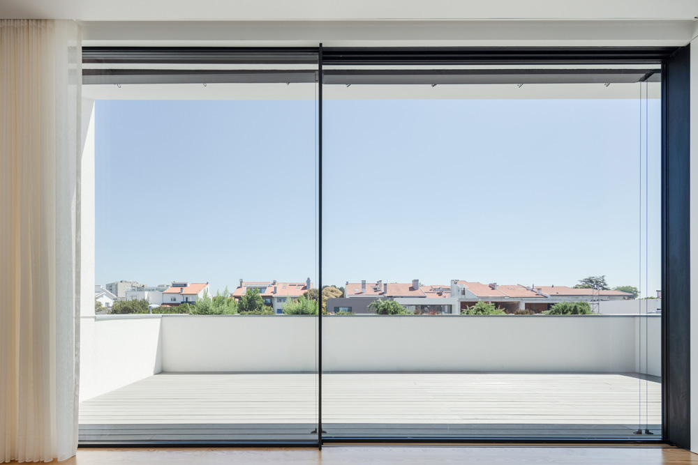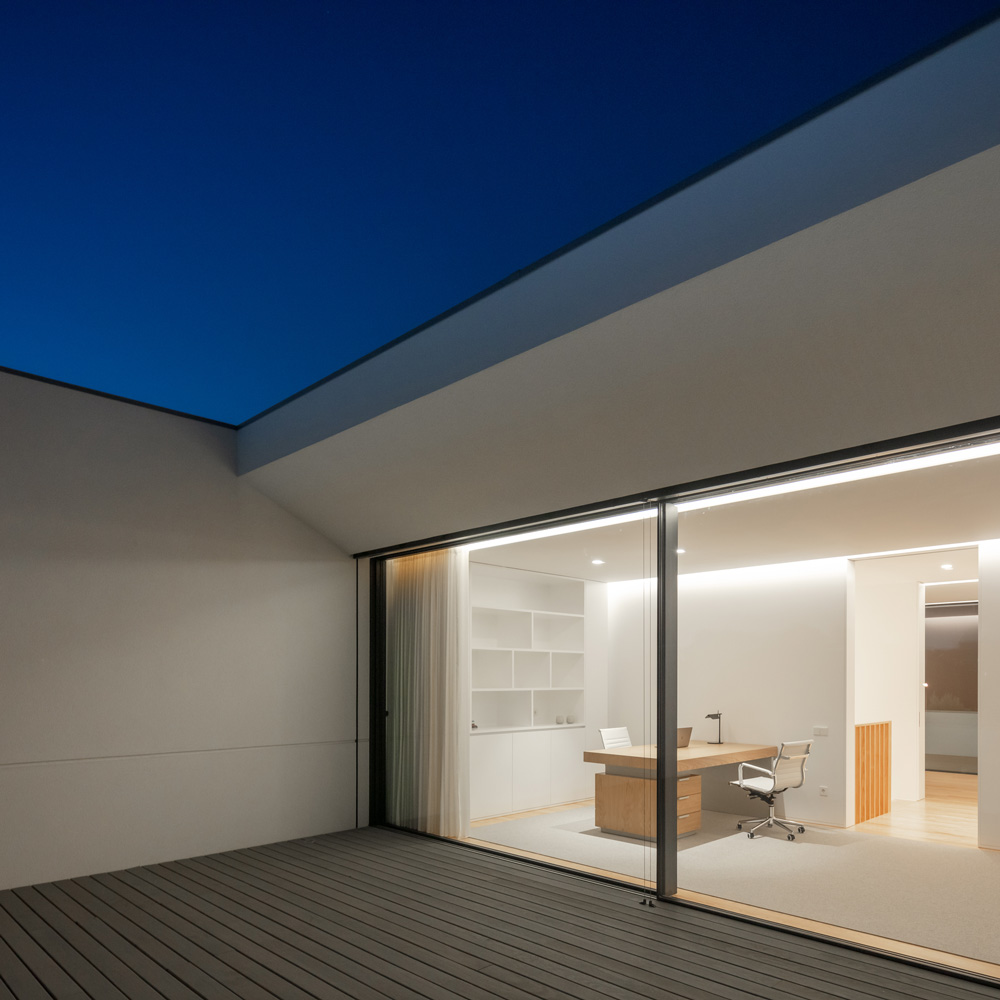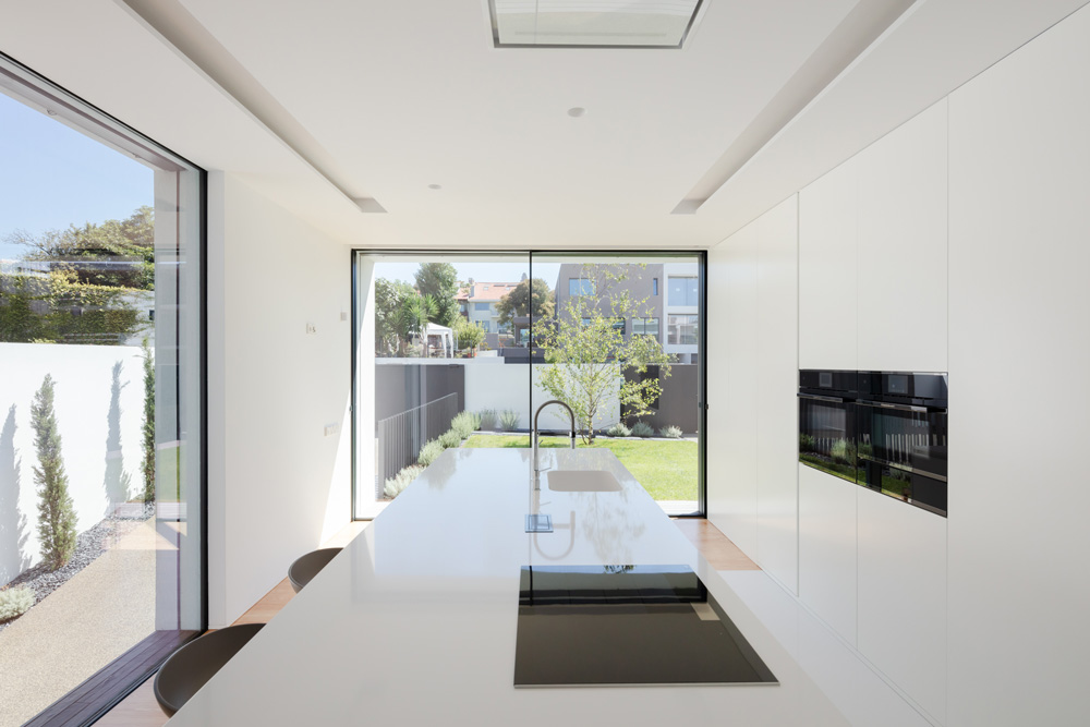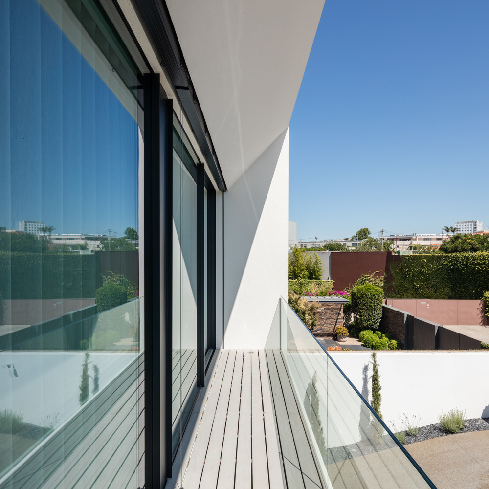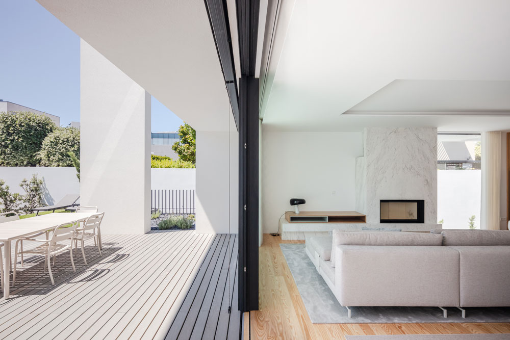 Des matériaux de luxe ont été choisis pour les espaces intérieurs tout de blanc et de bois. L’utilisation du marbre blanc se marie à merveille avec le sol et l’escalier en pin massif. Les menuiseries minimalistes haut de gamme HYLINE, laquées haute brillance, permettent la fusion entre l’intérieur et l’extérieur accentuant résolument l’atmosphère contemporaine de la villa.