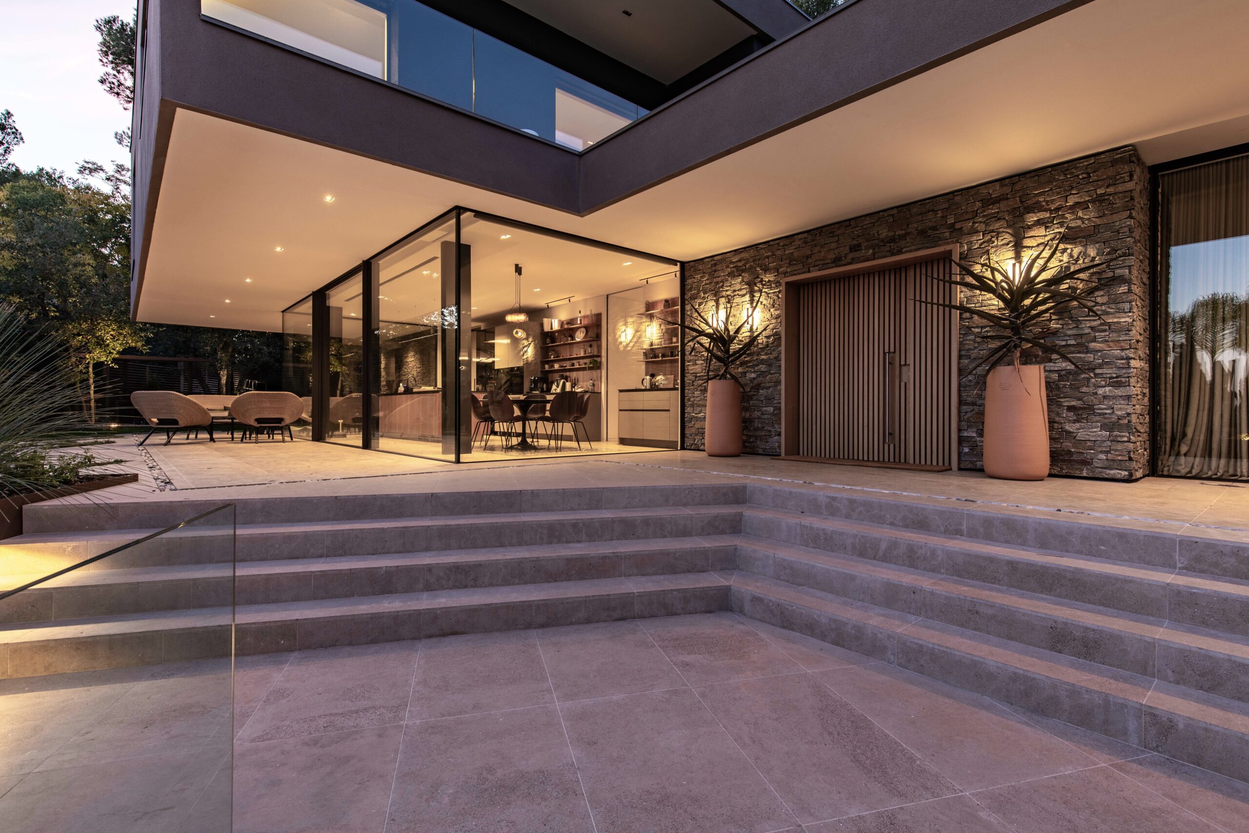 Dans un vaste terrain très boisé, cette villa s’articule en 3 niveaux qui proposent une expérience différente : Le rez de jardin très intimiste, un 1er étage entièrement vitré avec vue à l’horizon du littoral et le dernier avec vue sur la plaine. L’intérieur fusionne avec l’extérieur grâce aux baies minimalistes haut de gamme HYLINE dont le seuil intégré permet une continuité sans interruption de la pierre au sol, décuplant ainsi le volume tandis que l’avancée de toiture assure la transition.
